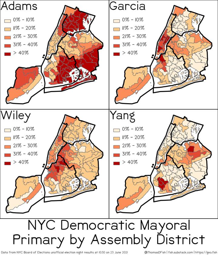 Choropleth map of the first choice votes in the 2021 New York City Mayoral Primary by