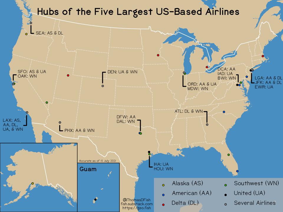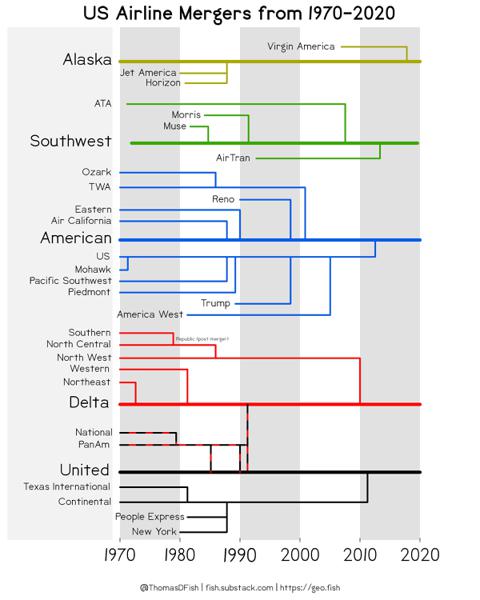 Two dementional timeline of the mergers of US-based airlines post-deregulation.