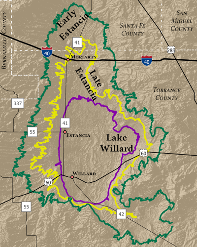 Three stages of Lake Estancia, an ice age pluvial lake in present-day New Mexico. Used