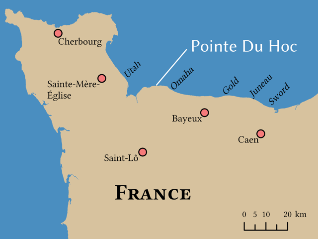 Location of Pointe du Hoc, the location of German bunkers that was captured by the